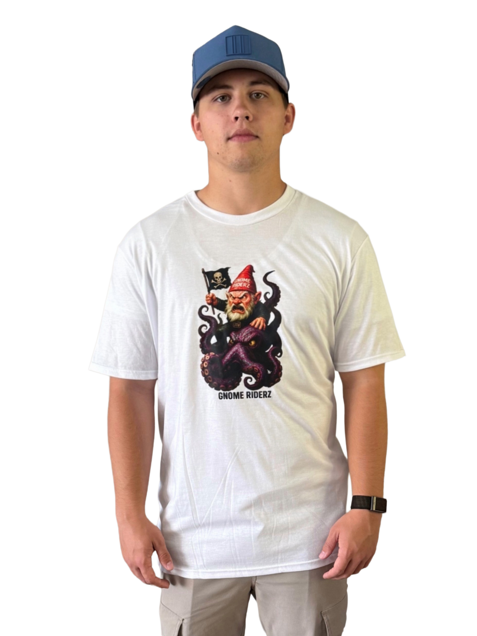 Set sail in style with the Gnome Octopus tee, featuring a daring gnome waving a pirate flag from his many-armed companion. Crafted from a premium tri-blend of 50% polyester, 25% cotton, and 25% rayon, this white shirt is lightweight, breathable, and comfortable enough for everyday wear all year long.